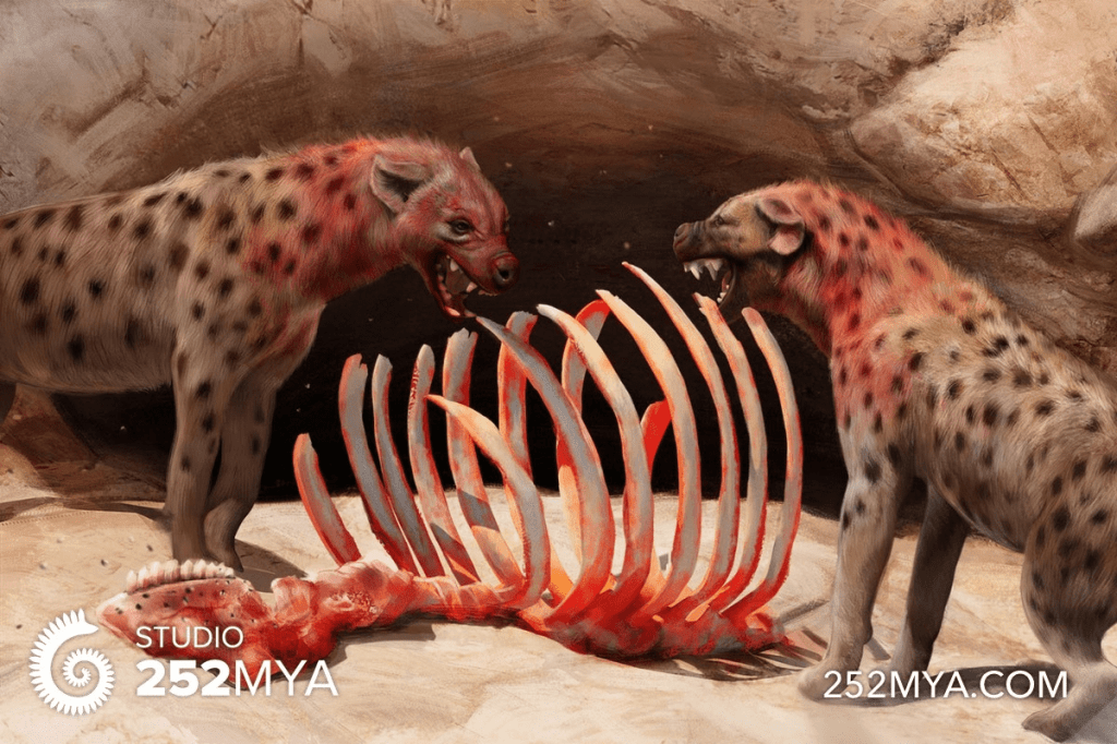 [1] Two Crocuta crocuta spelaea enjoying a meal, snarling at one another as they devour a carcass. Artwork by Lucas Lima.