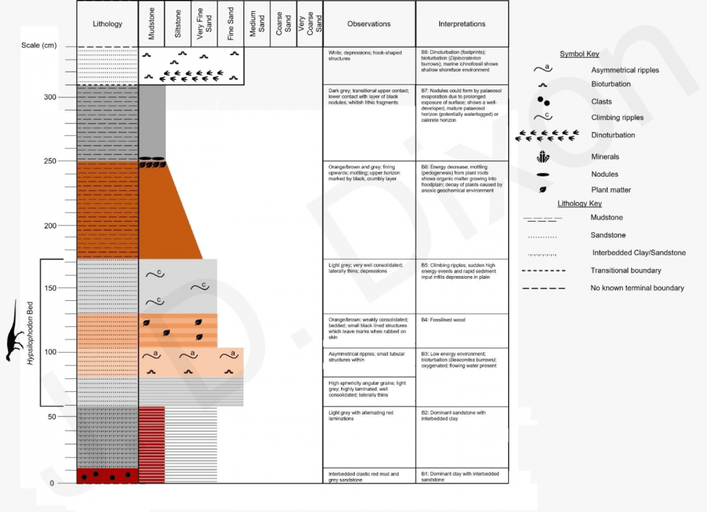 The Hypsilophodon Bed’s plant material and Beaconites burrows imply this was a non-marine, herbaceous, oxygenated environment, yet the small-scale asymmetrical ripples were produced by flowing water. Therefore, it is thought that these sandstones were deposited during high-energy crevasse-splay events across a floodplain or distal of levees, with enough temporal exposure post-deposition for colonisation by living organisms (such as plants and small invertebrates).