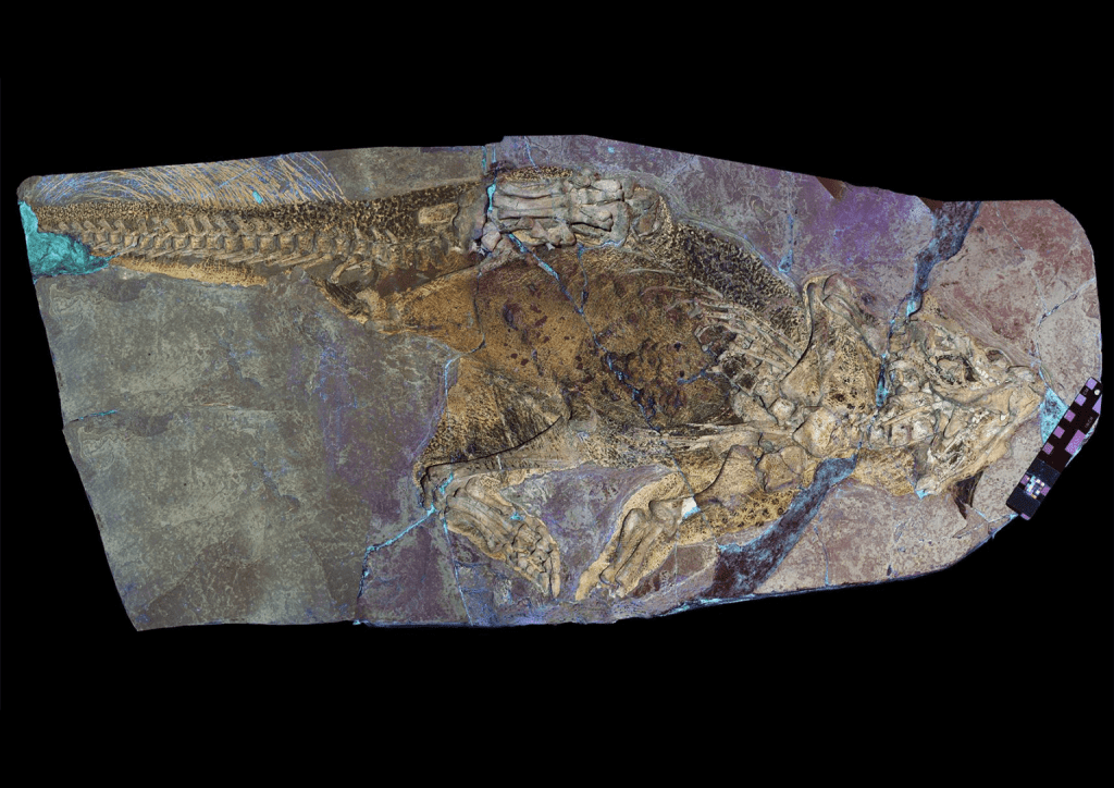 – Examining the preserved skin of my favourite fossil (the Seckenberg specimen of Psittacosaurus in Frankfurt, Germany) using laser fluoresce imaging with my collaborators Dr. Michael Pittman and Thomas Kaye.”