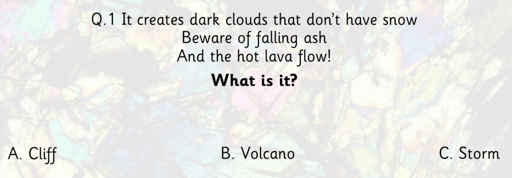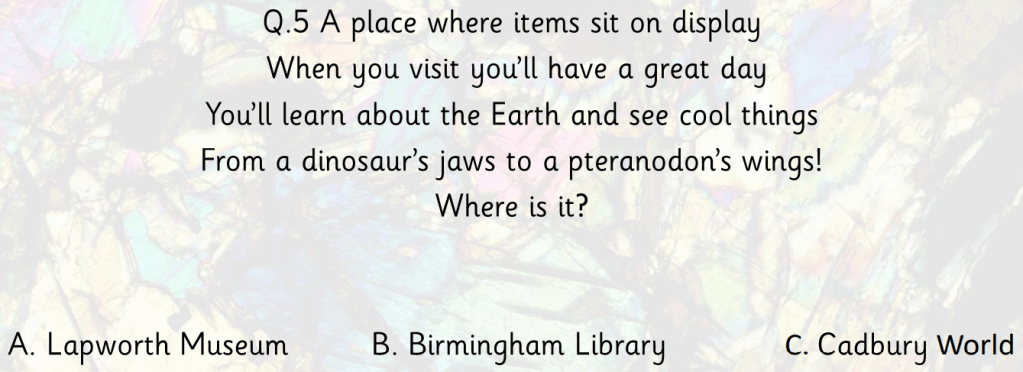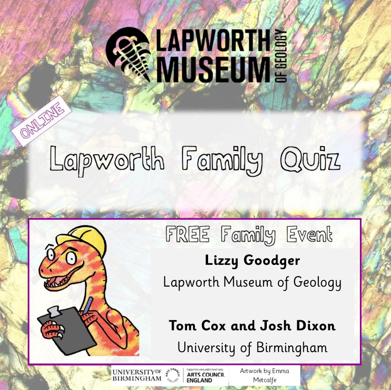 I helped design and present a round of questions for the Lapworth Family Quiz, hosted over Zoom. The quiz had wonderful engagement from everyone that attended and it was great to see that people enjoyed what we delivered. The round I organised was Georiddles, five geologically themed brainteasers with multiple choice answers (see below).